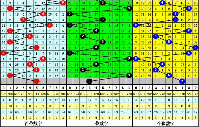 出现次数最少的三个号码分别为:0、6、8,本期预计这三个号码不会同时出现,排除号码:0。
