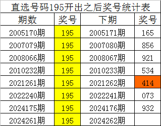 从上表统计可以看出,直选号码195开出之后,其下期奖号: