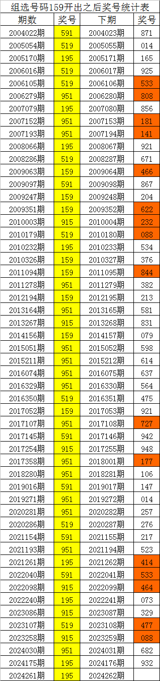 体彩排列三组选号码159历史上出现了52次,其下期奖号分别为:871、014、165、925、533、808、856、181、141、921、671、466、867、204、622、232、088、534、376、844、382、213、581、831、079、598、614、637、564、475、921、727、942、948、177、106、147、014、257、276、217、523、414、533、464、073、329、477、088、682、932,详细统计见下表:
