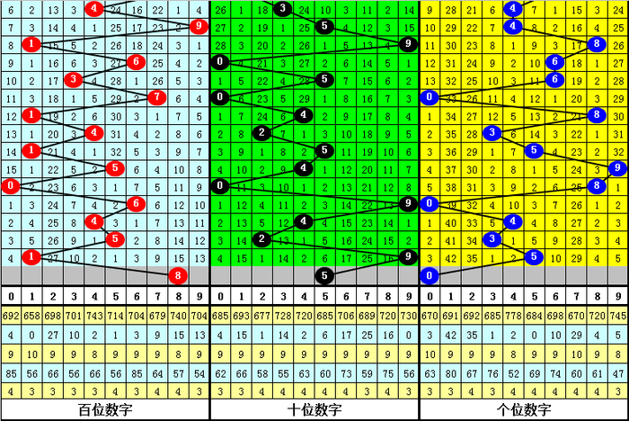 3、在以上0-9号码频次中,号码大小比为33:28,012路比为21:19:21,本期预计百位开出2路号码,参考号码8。