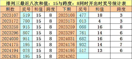 体彩排列三最近八次同时出现和值:15与跨度:8的奖号分别为:519、780、915、807、951、195、078、195,前七次下期开出奖号分别为:477、013、088、761、682、932、517,详见下表: