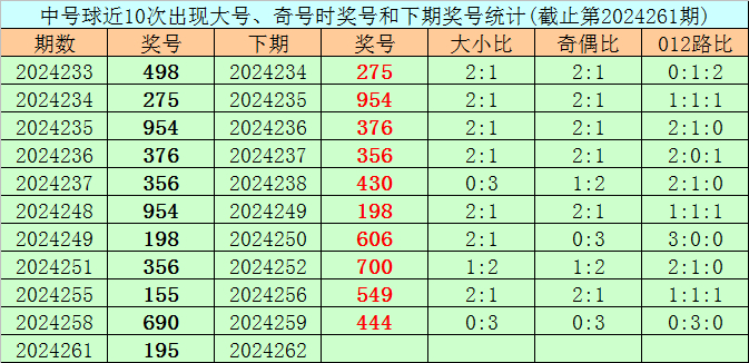 在中号球前10次开出大号、奇号类型之后,其下期分别开出奖号:275、954、376、356、430、198、606、700、549、444,其中号码奇偶比为6:4,大小比为5:5,012路比为4:4:2。