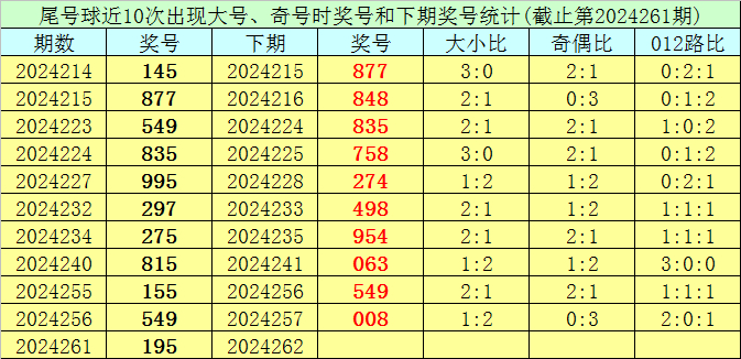在尾号球前10次开出大号、奇号类型之后,其下期分别开出奖号:877、848、835、758、274、498、954、063、549、008,其中号码大小比为7:3,012路比为2:3:5,奇偶比为4:6。