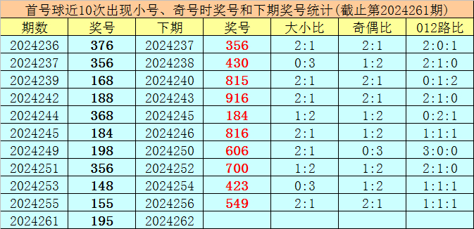 在首号球前10次开出小 号、奇号类型之后,其下期分别开出奖号:356、430、815、916、184、816、606、700、423、549,其中号码奇偶比为5:5,大小比为6:4,012路比为3:4:3。