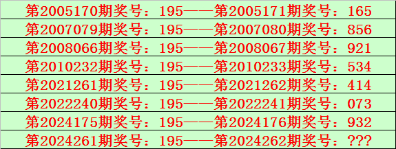排列三第2024261期开出奖号195,该号码直选类型历史上出现了8次,前7次开出之后期下期奖号为:165、856、921、534、414、073、932,见下表: