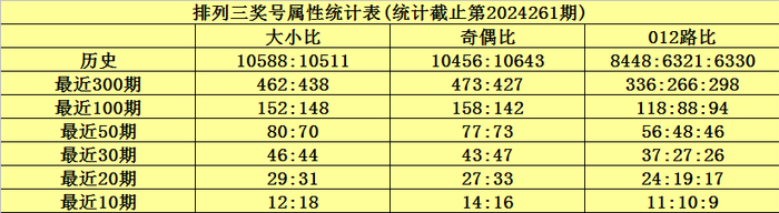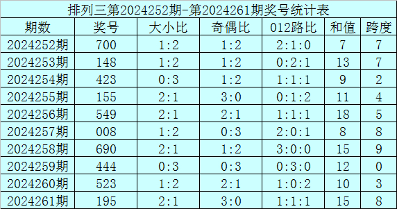 上期回顾:排列三第2024261期奖号为195,奖号012路比为1:1:1,奇偶比为3:0,大小比为2:1,和值为15,跨度为8。