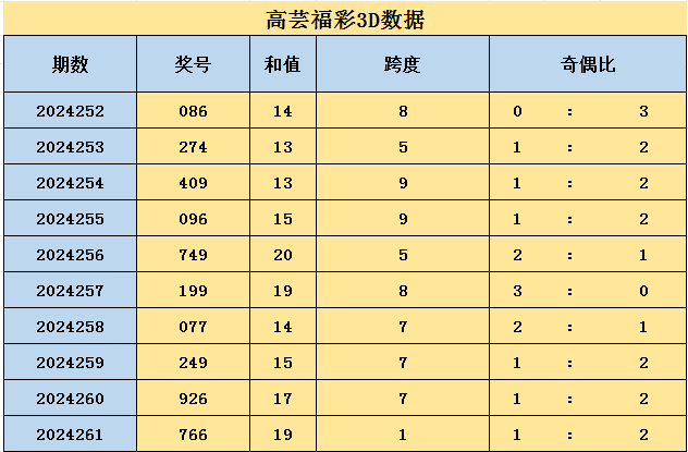 上期开奖:福利彩票3D第2024261期奖号为766。奇偶比为1:2,奖号和值为19,奖号跨度为1。