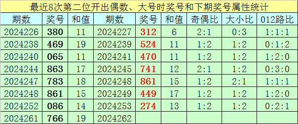 前7次第二位号码开出偶数、大号时奖号分别为:380、469、065、863、783、861、086,其中奇偶总比例为7:14,有5期奇偶比与上期奇偶比相同;号码大小总比例为13:8,每期奖号大小比与上期奖号大小比都不相同;