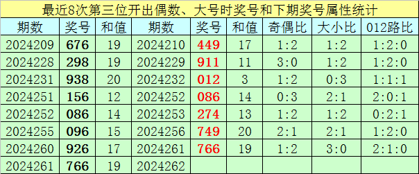 上期回顾:福彩3D第2024261期开出奖号为766,奖号奇偶比为1:2,大小比为3:0,012路比2:1:0。