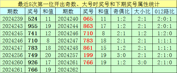 前7次第一位号码开出奇数、大号时奖号分别为:524、955、741、710、783、749、926,其中奇偶总比例为13:8,有2期奇偶比与上期奇偶比相同;号码大小总比例为12:9,有1期奖号大小比与上期大小比相同;