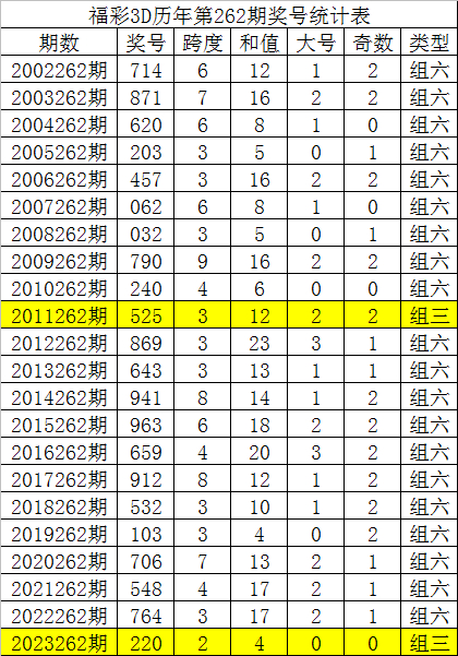 福彩3D历年第262期同期分别开出奖号:714、871、620、203、457、062、032、790、240、525、869、643、941、963、659、912、532、103、706、548、764、220,详细统计见下表: