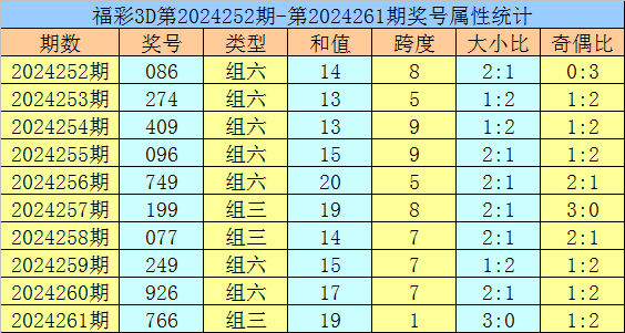 开奖回顾:福彩3D第2024261期开出奖号766。奖号形态为组三,奇偶比为1:2,012路比为2:1:0,大小比为3:0,和值为19,跨度为1。