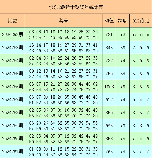 快乐8第2024261期奖号为:01 08 09 11 12 15 22 28 31 38 39 40 44 57 59 63 64 71 74 79,其中奖号012路比为6:7:7,和值为765,跨度为78。