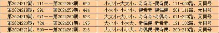 在排列三历史开奖中,第2024217期-第2024221期连续5期奖号为:111-291-971-724-500。
