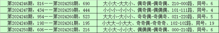 统计排列三已开出的奖号发现,在连续5期(第2024246期-第2024250)奖号为:816-434-954-198-606。