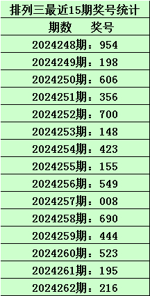 开奖回顾:排列三第2024262期开出奖号:216,其类型为:组六,直选形态为:偶奇偶、小小大、210路、冷冷温、质质合。