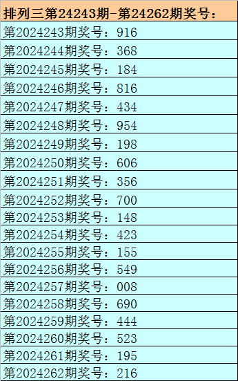 1.排列三最近十期分别开出号码:148-423-155-549-008-690-444-523-195-216,其中有5期奖号开出了上期的重复号码,本期预计第2024262期奖号:216中有重号,参考号码:6。