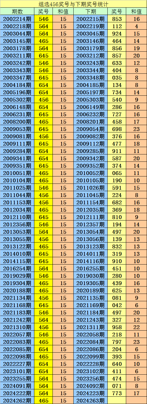第2024262期3D奖号组选为:456,历史上该号码组选出现53次,下期号码分别为:853、112、924、464、856、857、633、404、035、134、734、540、286、727、458、698、376、477、911、587、374、065、190、591、224、682、369、810、194、497、139、832、319、910、451、280、439、625、081、042、497、327、958、218、797、204、393、640、411、474、071、773。