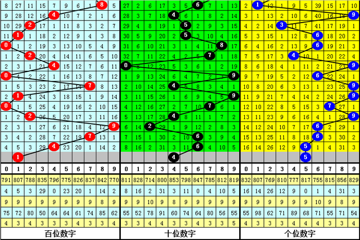 号码频次分析:最近10周星期日各号码组选出现频次分别为:号码9出现6次,号出现5次,号码2、3、4出现4次,号码6、8出现3次,号码0、1出现2次,号码5、7出现1次,本期注意最热四码:2349中包含胆码,预计奖号不会全部分布在最冷四码:0157中。