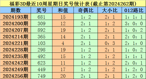 福彩3D第2024256期(上周星期日)奖号为749。其中奖号奇偶比为2:1,大小比为2:1,012路比为1:2:0。