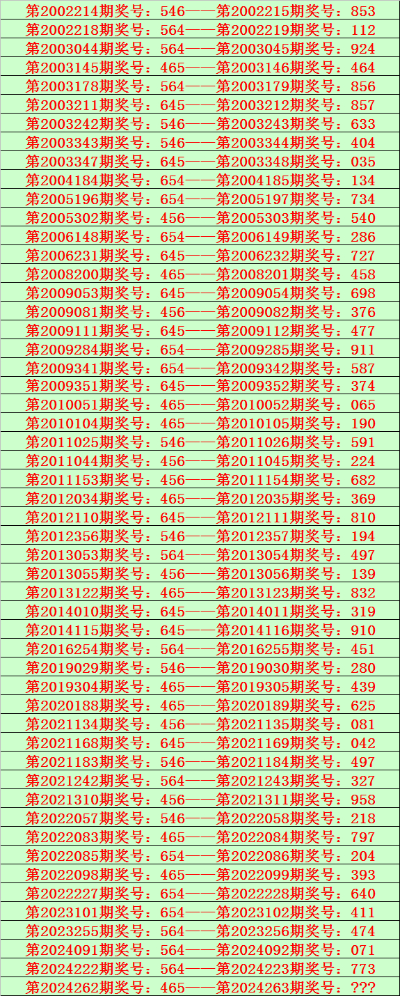 福彩3D第2024263期开奖日期:2024年9月29日,历史上第263期已开出了22次奖号,历年同期号码分别为:857、943、967、617、541、217、700、292、413、928、799、681、304、082、489、672、813、949、007、194、289、335。