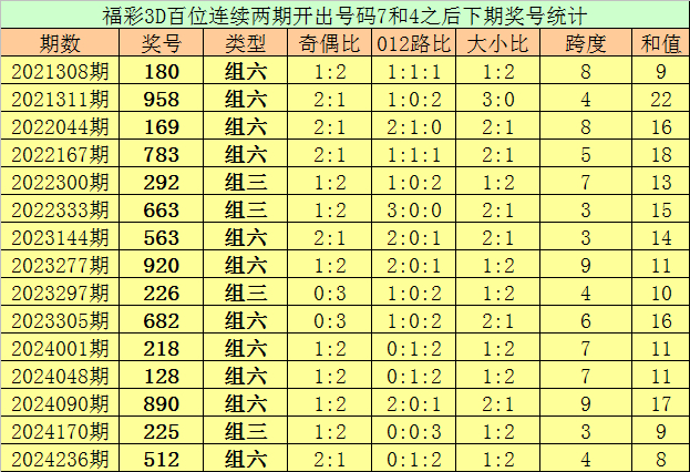 百位号码:连续两期百位出号分别为:7-4,历史上福彩3D连续两期前后分别出号7-4的奖号共出现77次。在百位7-4的奖号现象出现时,近15期下期分别出号:180-958-169-783-292-663-563-920-226-682-218-128-890-225-512;