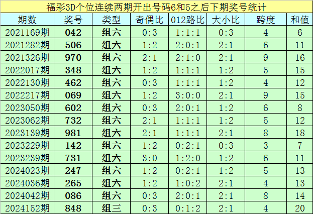 个位号码:最近两期个位开出号码为6-5,在福彩3D历史开奖中,前后两期个位分别开出号码6-5的奖号出现了81次。最近15期个位6-5组合出现之后,其下期奖号分别为:042-506-970-348-462-069-602-732-981-142-731-247-265-086-848;