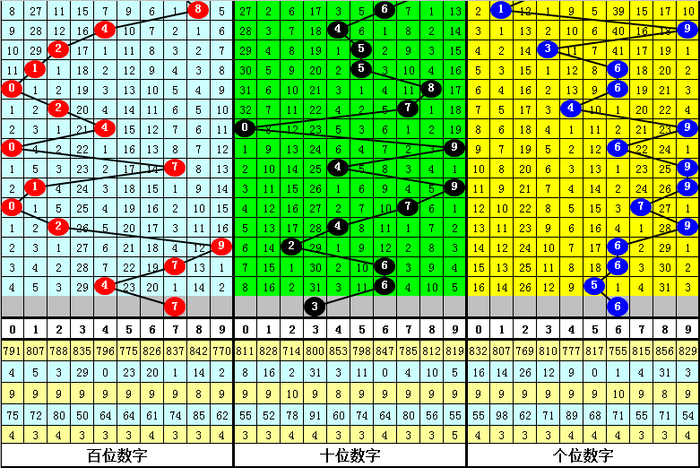 百位分析:上期百位开出奖号:4,最近9期该位奖号大小比为3:6,其中大号7出现2次,9出现1次,5、6、8出现0次,小 号0、4出现2次,1、2出现1次,3出现0次,本期百位参考大号,胆码关注7。