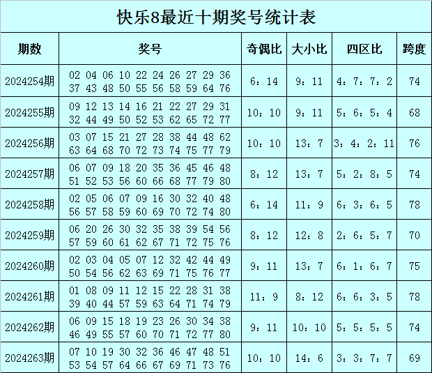福彩快乐8第2024263期开奖回顾:07 10 19 30 32 36 46 47 48 51 53 54 57 64 66 67 69 71 73 76,其中奖号奇偶比开出10:10,大小比开出14:6,四区比开出3:3:7:7,跨度开出69。