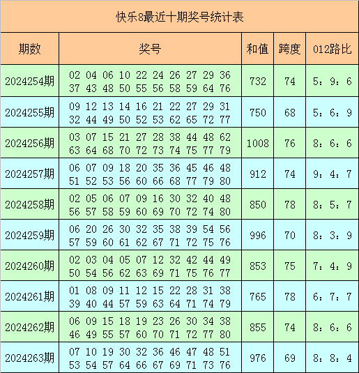 快乐8第2024263期奖号为:07 10 19 30 32 36 46 47 48 51 53 54 57 64 66 67 69 71 73 76,其中奖号012路比为8:8:4,和值为976,跨度为69。