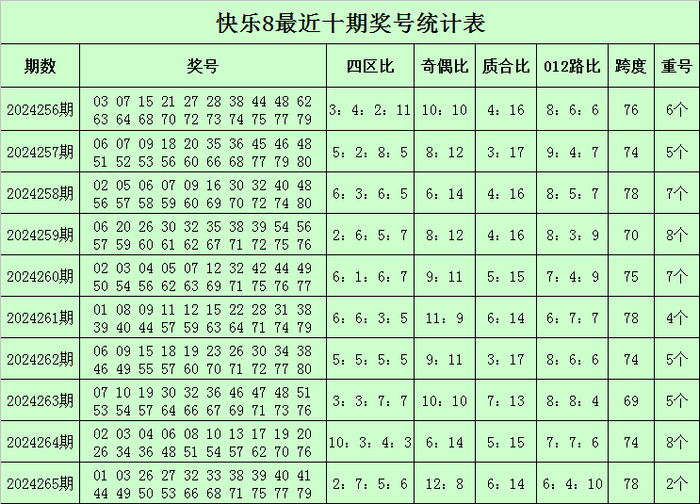 福彩快乐8第2024265期开奖回顾:01 03 26 27 32 33 38 39 40 41 44 49 50 53 66 68 71 75 77 79,其中奖号四区比为2:7:5:6,奇偶比为12:8,质合比为6:14,跨度为78,012路比为6:4:10,开出2个重号:03、26。