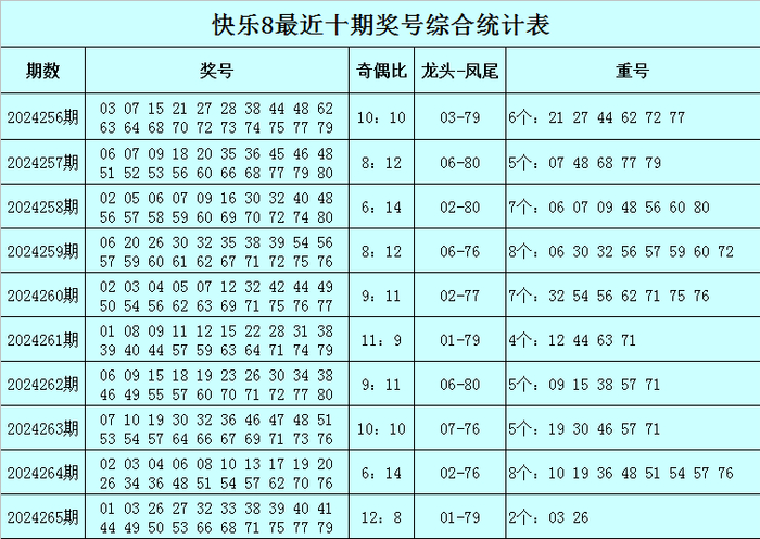福彩快乐8第2024265期开出奖号:01 03 26 27 32 33 38 39 40 41 44 49 50 53 66 68 71 75 77 79,其中奖号奇偶比为12:8,出现2个重号03、26,开出连码26 27、32 33、38 39 40 41、49 50。