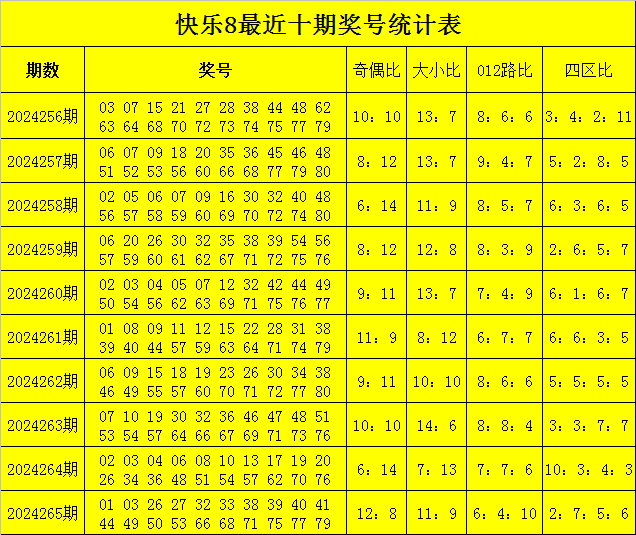 福彩快乐8第2024265期开奖回顾:01 03 26 27 32 33 38 39 40 41 44 49 50 53 66 68 71 75 77 79,其中奖号大小比为11:9,012路比为6:4:10,和值为912,跨度为78,奇偶比为12:8。