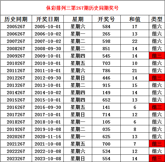 2024年10月7日排列三第267期开奖,历史同期分别开出奖号: