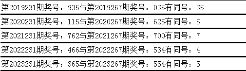 与前期历史同期奖号对比分析,在最近五年开奖中,第231期同期奖号与第267期同期奖号都出现了相同号码: