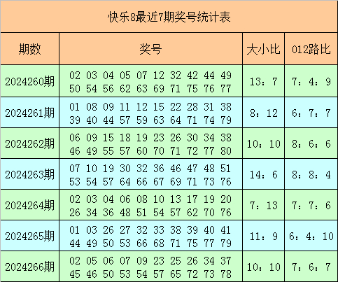 快乐8第2024266期奖号为:02 05 06 07 09 23 25 26 34 37 45 46 50 53 54 57 65 72 73 78,其中奖号012路比为7:6:7,大小比为10:10。