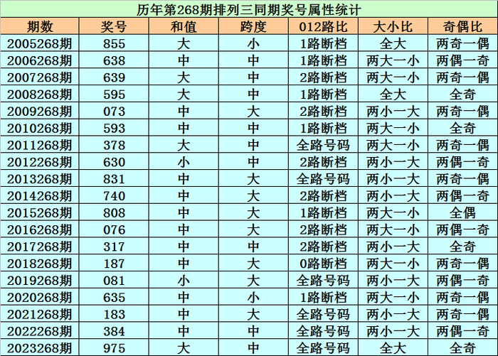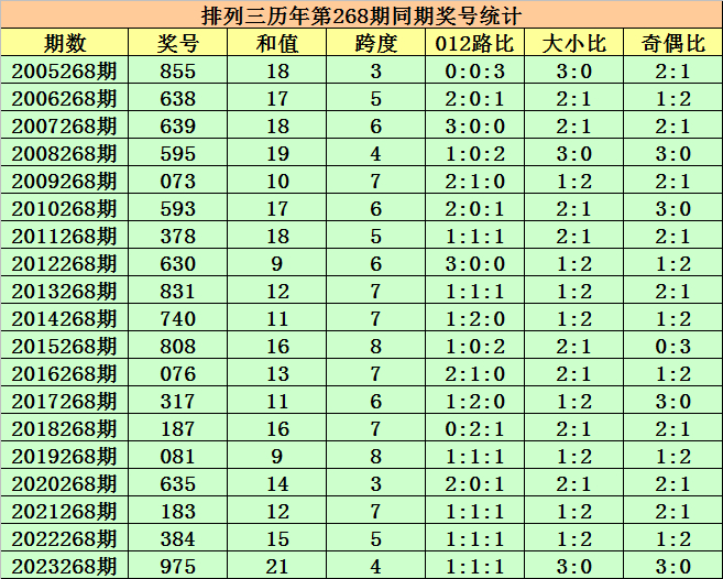 历史上第2024268期排列三已开出19期奖号了,历年同期奖号分别为:855、638、639、595、073、593、378、630、831、740、808、076、317、187、081、635、183、384、975,详细统计见下表: