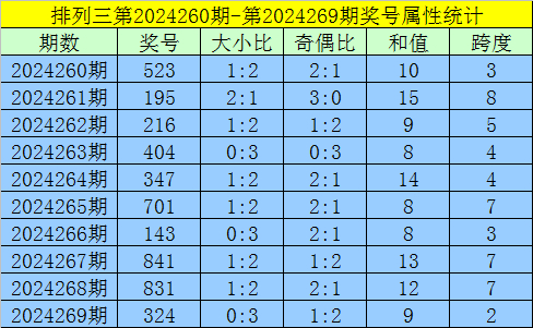 上期回顾:排列三第2024269期出现奖号324。开出组六,奇偶比1:2,012路比1:1:1,大小比0:3,和值9,跨度2。