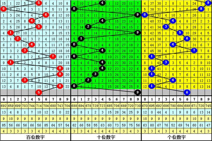 末位跨度分析:前3期末位奖号为1-4-1,最近两期末位奖号跨度为3、3,末位奖号跨度历史上连续两期开出3、3的现象共152次,其最近两次奖号为: