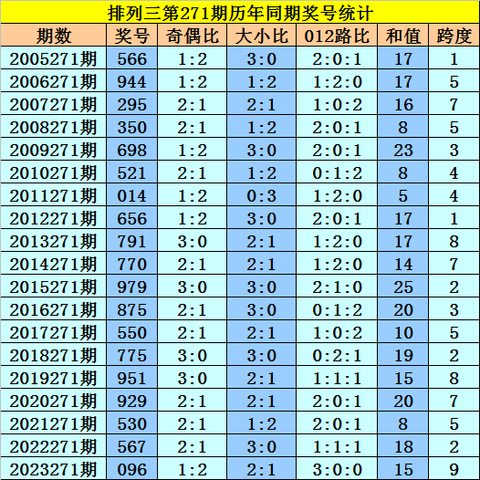 本期为排列三第2024271期开奖,历史上排列三第271期已开出了19期奖号了: