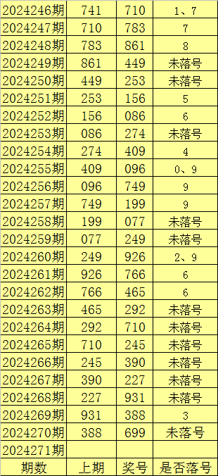 福彩3D第2024270奖号699,重号未落号。在最近100期(第2024171期-2024270期)中,重号落号54期;最近20期重号落号概率为50%;最近10期重号落号概率为30%。本期防重号中号码轮空。