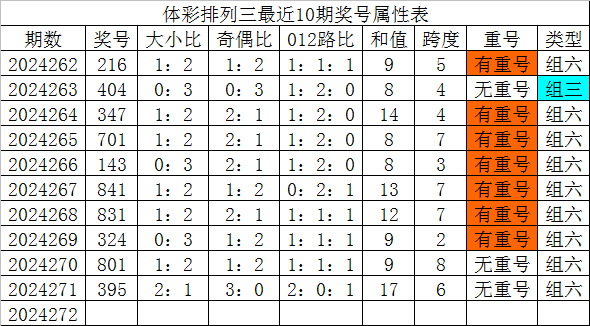 体彩排列三最近10期分别开出奖号:216、404、347、701、143、841、831、324、801、395,各奖号属性详见下表: