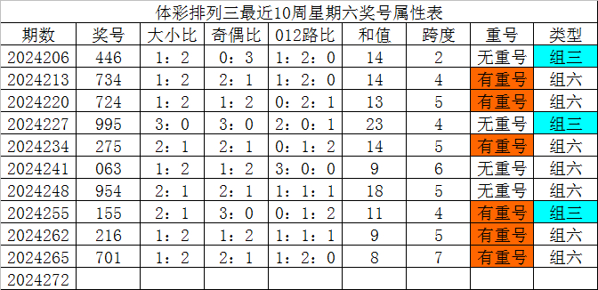 体彩排列三最近10周星期六奖号分别为:446、734、724、995、275、063、954、155、216、701,各奖号属性详见下表: