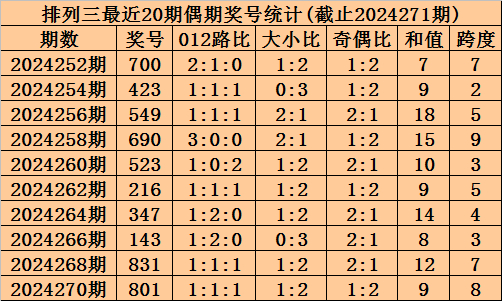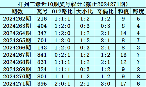 上期回顾:排列三2024271期奖号为395,奇偶比为3:0,大小比为2:1,跨度为17。