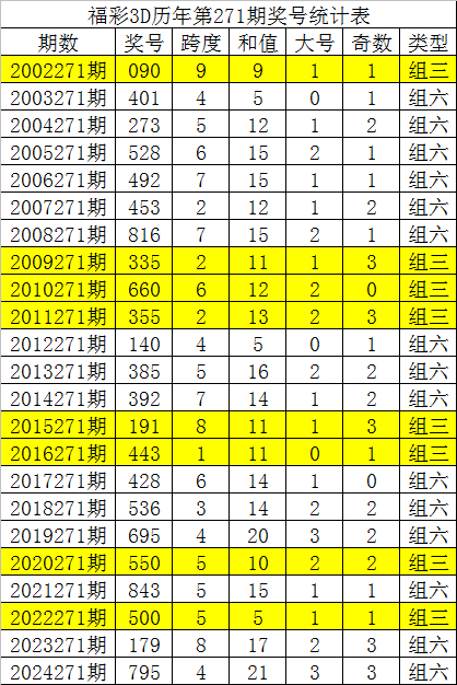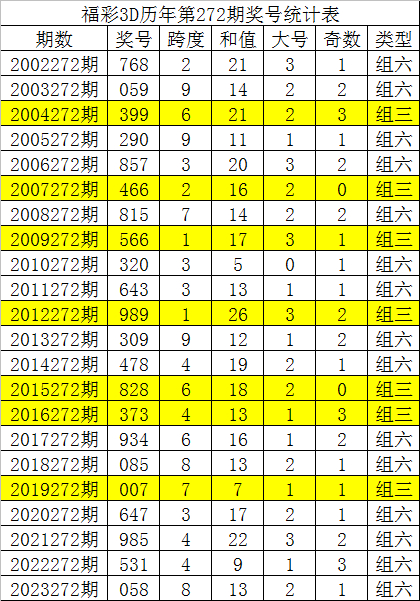 从以上统计可以看出,历年3D第272期开出了7次组三号码,开出了15次组六号码。组六号码出现概率大,本期预计开出组六号码。