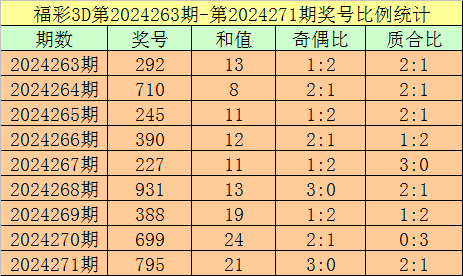 开奖回顾:福彩3D第2024271期:奖号为795,奖号质合比为2:1,大小比为3:0,跨度为4,类型为组六。