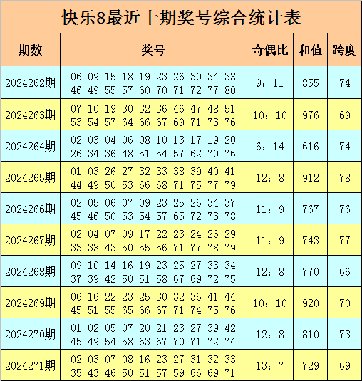福彩快乐8第2024271期开奖回顾奖号:02 03 07 08 16 23 27 31 32 33 35 43 46 50 51 57 59 66 69 71,其中奖号奇偶比为13:7,和值为729,跨度为69。