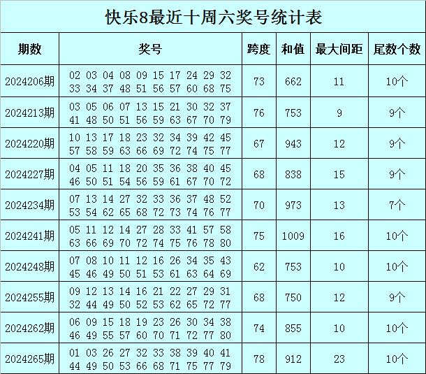 福彩快乐8第2024265期(上周六)回顾:01 03 26 27 32 33 38 39 40 41 44 49 50 53 66 68 71 75 77 79,其中奖号首尾间距为78,和值为912,最大间距为23,尾数分布为:尾数2、4、5包含1个号码,尾数0、6、7、8包含2个号码,尾数1、3、9包含3个号码。