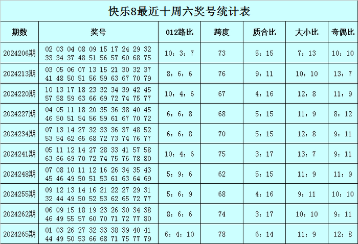 福彩快乐8第2024265期(上周六)开奖回顾:01 03 26 27 32 33 38 39 40 41 44 49 50 53 66 68 71 75 77 79,其中奖号012路比为6:4:10,跨度为78,质合比为6:14,大小比为11:9,奇偶比为12:8。