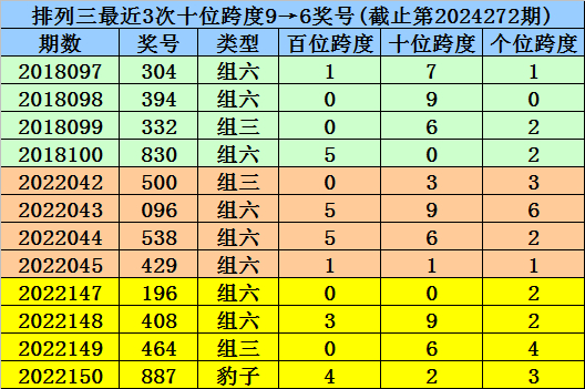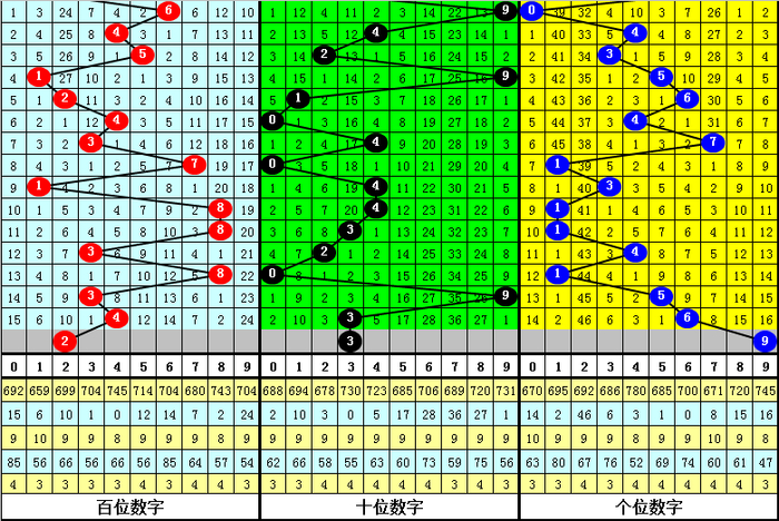 中位跨度分析:最近3期中位分别开出奖号0-9-3,最近两期跨度分别开出9、6,中位号码历史上连续两期跨度开出9、6的奖号共开出20次,其前两次奖号开出: